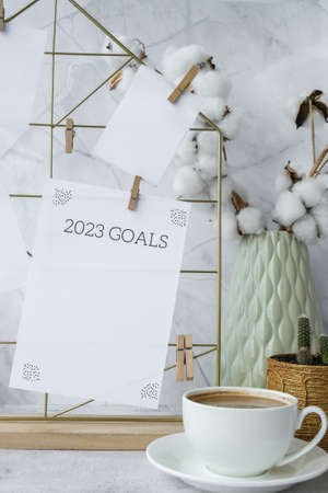 2023 goals. Paper notes with 2023 goals written. Concept photo of planning new years resolutions and goal setting
