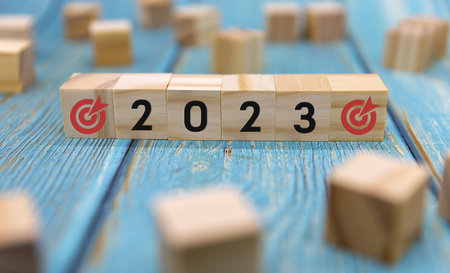 2023 block with dartboard sign. Business Goal, Target, Resolution, strategy, plan, Action motivation, mission, thinking, and New Year start concepts