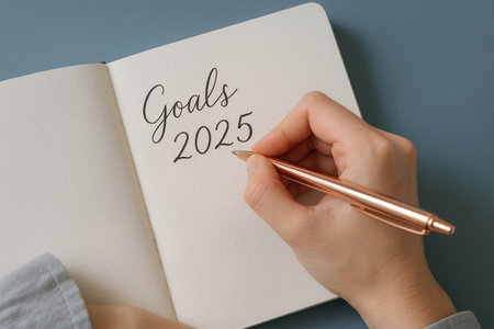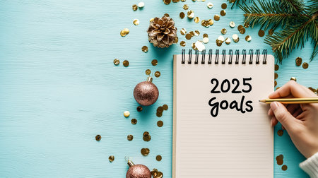 Person writing goals for 2025 in a dotted notebook with a copper pen on a blue desk to plan personal aspirations and resolutions.