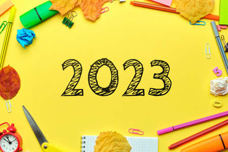 The concept of the new year 2023. Education or DIY with different inventory on the table.