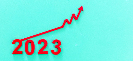 2023 Economic growth or financial crisis. New Year number and red arrow up. Interest rate increase, rising inflation.