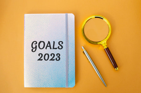 Notebook Goals 2023 on a yellow background. Motivation, inspiration. Planning, plans and tasks. New business ideas. Setting goal, target. Magnifying glass and pen