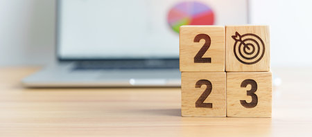 Business planning in 2023 concept. Wooden cubes with the letters 2023 and goal icon for business strategy. New year's eve and change the year 2022 to 2023