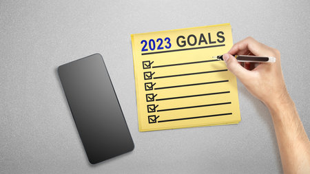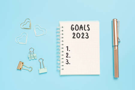 Human hand writing the 2023 goal list is on the note paper. Goals of 2023. Happy New Year 2023