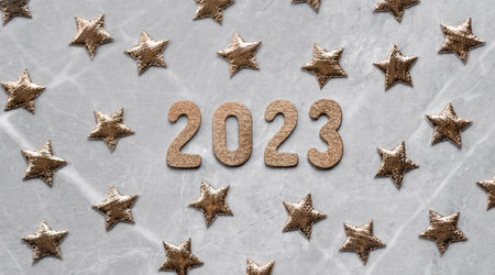 Banner. Happy New Year. Gold numbers 2023 and gold stars on a fashionable gray marble background. flat lay.