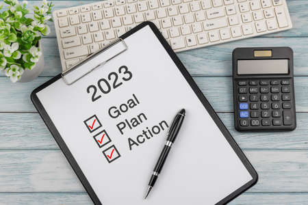 2023 year block on table. goal, Resolution, strategy, plan,, start, budget, mission, action, motivation and New Year holiday concepts
