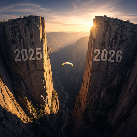 A silhouette depicts a person leaping from a cliff's edge against a bright backdrop. The artwork shows dramatic lighting and contrasts. The image portrays a theme related to the concept of the New Year, aiming at an inspirational use. The composition suggests themes of determination and new beginnings, which suits advertising purposes.