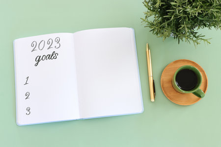 Business concept of top view 2023 goals list with notebook, cup of coffee over wooden desk