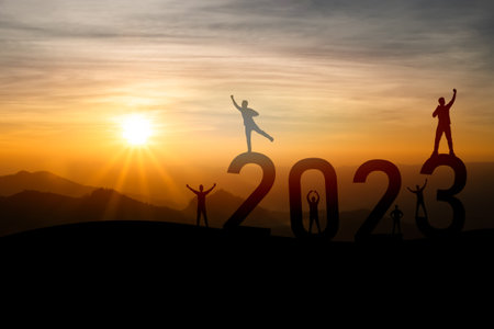 Man raise two hand success happy new year 2023 concept, silhouette of man jumping over barrier cliff and success with sunset background. Happy New Year 2023 use for web banner and advertisement.
