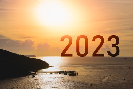 Happy new year 2023 sea mountain sunset success concept, silhouette of island sea mountain view sunlight success with sunset background. Happy New Year 2023 use for web banner and advertisement.