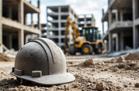 Dusty helmet, deserted construction site. Unfinished buildings, idle machinery. Industry, work, abandonment, decay, close up.