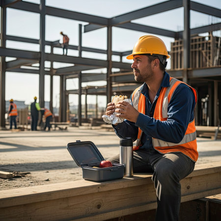 A construction worker wearing a safety vest and helmet pauses for a meal. The image features the worker eating a sandwich outdoors, with a lunchbox and thermos nearby. The scene is illuminated by daylight, highlighting the steel framework of the building site, and could be used for articles on construction and workplace safety.