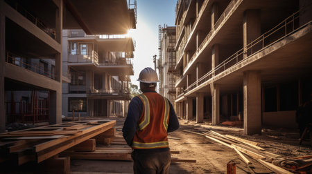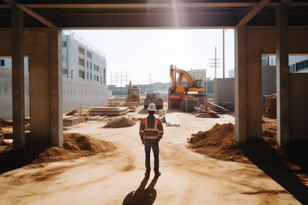 Construction worker in yellow safety vest and hard hat stands at construction site, observing the work with sunlight illuminating the environment, emphasizing safety and professionalism, AI generated