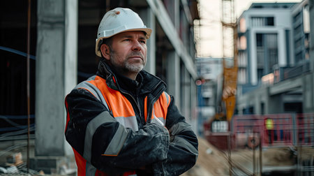 A vigilant construction professional in a bright safety gear surveys ongoing development amid towering cranes and modern cityscape silhouettes, capturing urban growth ene