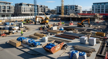 An active construction site is filled with heavy machinery like excavators, cranes, and building materials in the foreground, with new, modern apartment buildings in the background. The scene depicts a busy urban development project and the growth of a modern city.