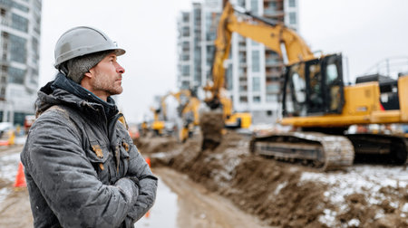 A focused construction worker in a hard hat supervises excavation operations at a snowy urban site, showcasing the challenges of winter construction.