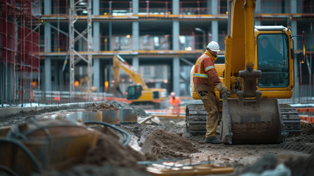 A bustling construction site featuring heavy equipment and workers actively engaged in digging and building in an urban environment. Safety gear is prominent.
