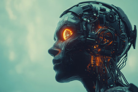 A detailed side profile of a human head reveals advanced robotic implants and a glowing eye, showing a futuristic blend of biology and technology.
