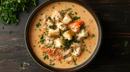 Top view of a bowl of creamy lobster bisque with fresh herbs and croutons on a dark wooden table