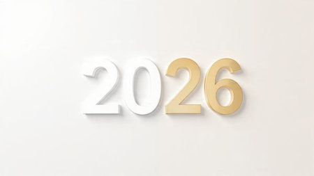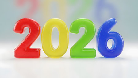 Glossy 3D numbers spelling 2026 in red yellow green and blue on a white surface. Clear details an...
