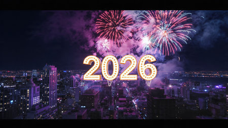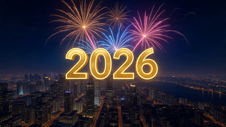 The year 2026 written in glowing blue neon light painting against a city skyline. Clear details a...