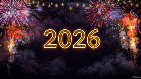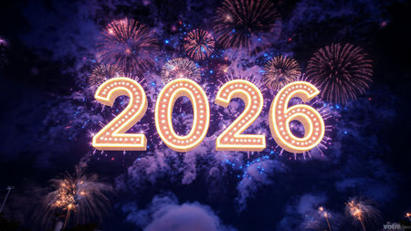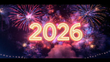 Happy new year 2026 written with Sparkle firework and bokeh background