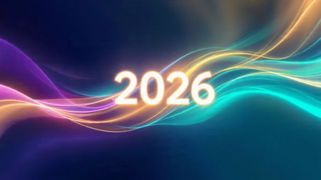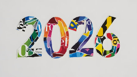 A close-up of brightly colored toy bricks forming the year 2026 on a white surface. Clear details...