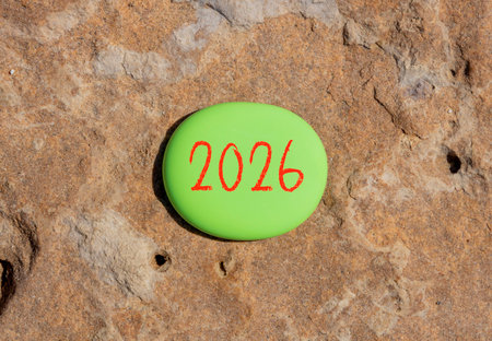 Business concept of 2026 new year symbol. Concept number 2026 Happy new year on beautiful green stone. Beautiful brown stone background. Business 2026 happy new year concept. Copy space.