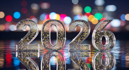 A Happy new year shiny 2026 glass number with glitter on night city light reflection for merry christmas eve