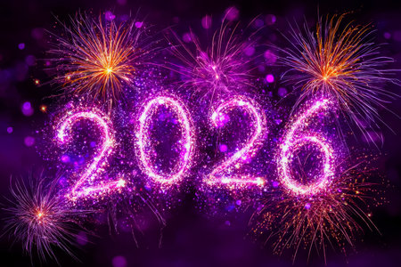 2026 Happy New Year with space copy on purple glitter background