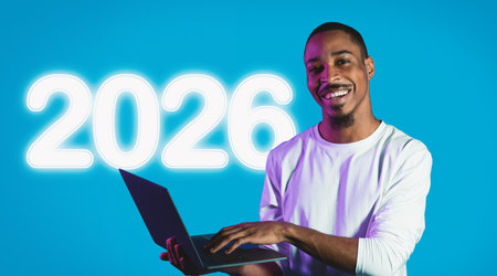 Man Smiling With Laptop in Front of Illuminated 2026 Backdrop in Neon Colors