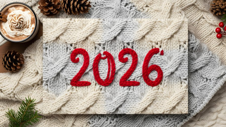 Red 2026 numerals on a knitted background with hot chocolate and pine cones Clear details and vib...