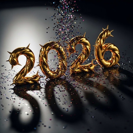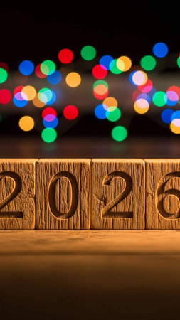 Wooden numbers 2026 rest on colourful surface with golden glitter