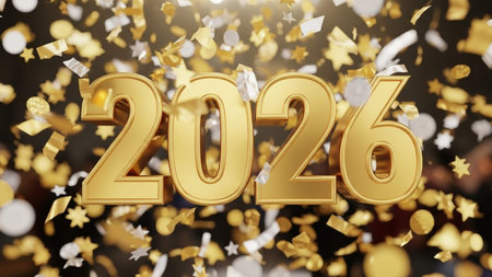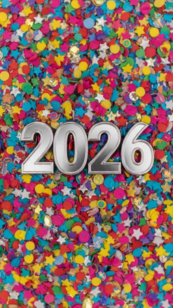 Number 2026 on a colorful confetti background.