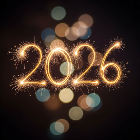 Hand holding a sparkler writing the year 2026 with blurred bokeh lights in the background.