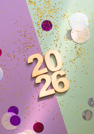 Wooden numbers 2026 on colourful surface with golden glitter