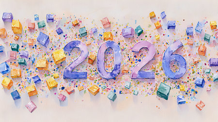 Playful Watercolor Art of 2026 with Vibrant Confetti and Colorful Patterns Concept of New Year Celebration Festive Creativity Artistic Expression.