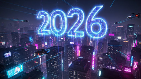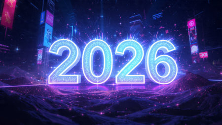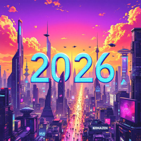 Bright pink neon year 2026 glows against a dark, futuristic city.