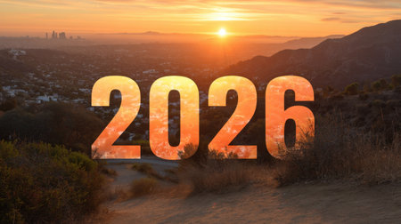 A stunning sunset view over Los Angeles features bold text reading 2026, symbolizing hope and new beginnings. The tranquil landscape showcases natural beauty.