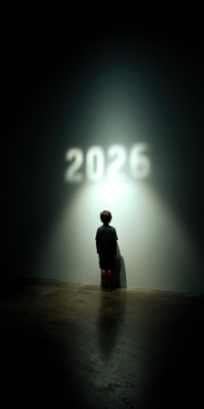 Child standing in a dark room, looking up at the illuminated number 2026 projected onto a wall, symbolizing anticipation of the future, hope, and the passage of time