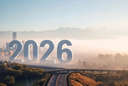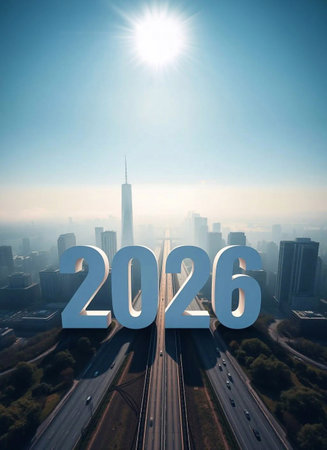 Happy New Year 2026 The number 2026 is located on the highway in the big city in the morning.