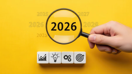 A hand holds a magnifying glass over the year 2026, with icons for growth, ideas, process, and goals on cubes below, symbolizing strategic business planning on a yellow background.
