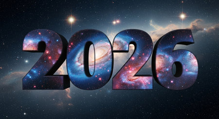 Bright blue neon numbers 2026 illuminate a dark background with cosmic dust and light.