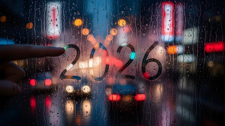 Finger points to 2026 on a wet window with blurred traffic lights Clear details and vibrant color...