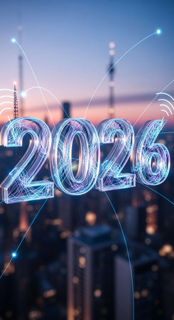 Brightly lit numerals forming the year 2026 are set against a dark blue evening sky over a city silhouette. The image features a long exposure effect, creating light streaks. This visual could be used for various purposes including promotional materials or design templates.