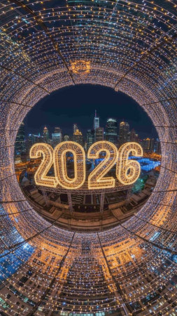 Giant numbers stand tall, showing hopes for a vibrant 2026 night skyline.