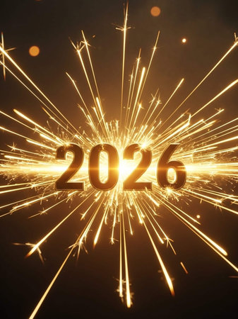 The year 2026 is illuminated by sparkling lights against a deep blue starry night sky.