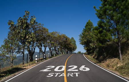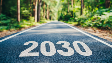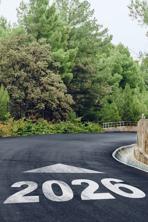 Curved road ahead with clear indication of the year 2026 surrounded by lush greenery