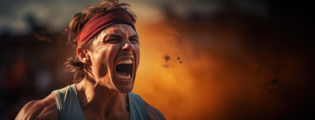Emotional young man, professional athlete, sportsman expressing emotions of win, success. Outdoor game