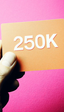 Hand holding 250K followers or subscribers social media celebration card on textured background
